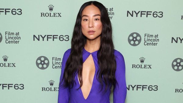 Грета Лі продовжує свою стильну серію у прозорій ультрафіолетовій сукні