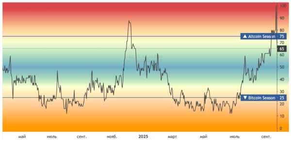 11 вересня індекс сезону альткоїнів досяг максимуму з кінця 2024 року. Показники CoinGlass та Blockchain Center становили 78 пунктів. На фоні падіння крипторинку на момент написання показники знизилися до 65.