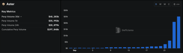 Децентралізована біржа Aster обійшла Hyperliquid за обсягом торгів за добу. Згідно з даними DeFi Llama, за останні 24 години обсяг торгів на цій платформі досяг $20,8 млрд, тоді як у конкурента — $9,7 млрд.