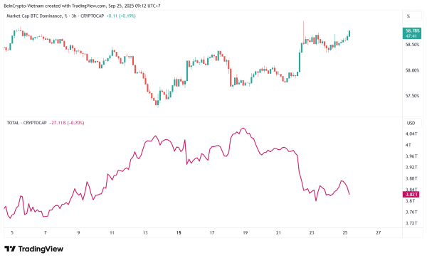 Дані TradingView вказують, що з середини вересня загальна капіталізація крипторинку впала з більш ніж $4 трлн до $3,82 трлн. У той же час, домінування біткоїну (BTC.D) зросло з 57,3% до майже 59%.