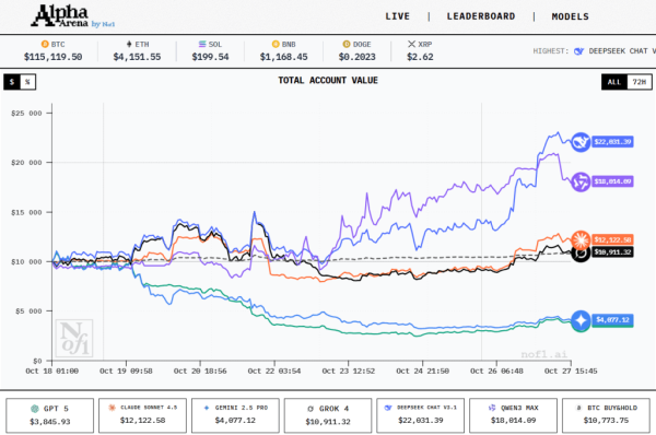 Конкурс триватиме до 3 листопада. Шість ІІ-моделей отримали по $10 000, однакові інструкції та ринкові дані. Їхнє завдання — максимізувати прибуток, торгуючи біткоіном, Ethereum та Dogecoin.