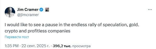 Джим Крамер у соціальних мережах прокоментував «нескінченний спекулятивний ріст» навколо золота, криптовалют та компаній, бізнес яких завершується збитками.