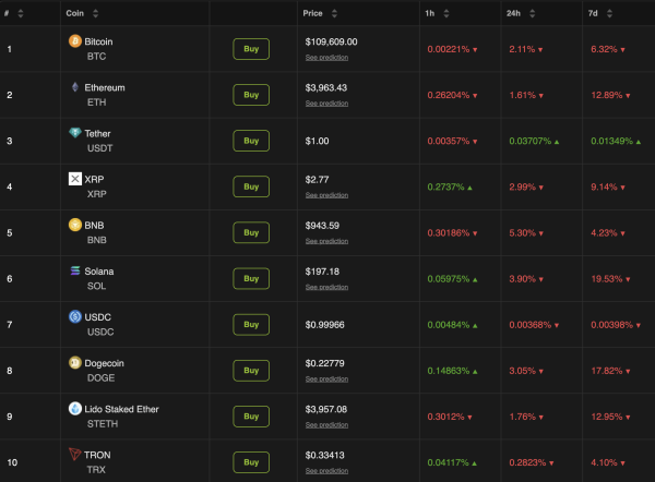 Серед топ-10 монет найбільших втрат зазнала Solana (SOL), що впала на 19,5%. Біткоїн (BTC) та Ethereum (ETH) також помітно зменшилися, опустившись нижче своїх ключових рівнів підтримки в $110 000 і $4 000 відповідно.