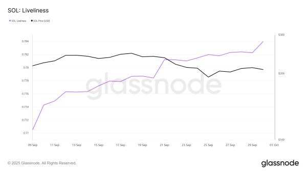 Ончейн-дані показують зростаючий песимізм серед довгострокових власників (LTHs). Метрика Liveliness Solana різко зросла в останні тижні, вказуючи на збільшення кількості монет, що залишають сплячі гаманці. Це говорить про те, що LTH продають активи, знижуючи впевненість і чинячи тиск на ціну альткоїну.