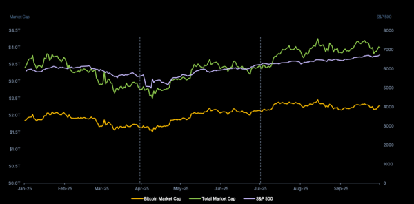 Загальна волатильність ринків помітно знизилася: річний показник індексу S&P 500 упав із 30,7% до 10,6%, а біткоїну — з 42,1% до 29,2%.