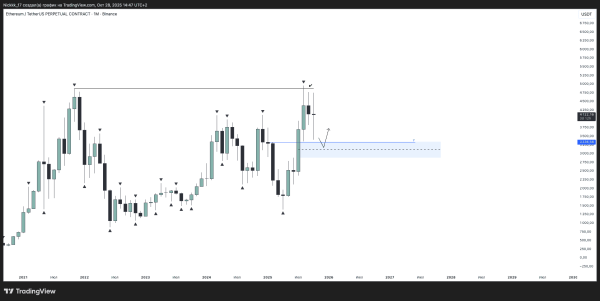 Місячний графік особливо без змін. Після зняття ATH ціна імпульсно дала відкат, але пам'ятаємо тест місячного FVG в області $3353-$2879.