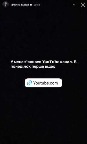 Колишній міністр закордонних справ України Дмитро Кулеба анонсував запуск власного YouTube-каналу. Перше відео на ньому з’явиться у понеділок. Про це дипломат повідомив у Instagram Stories.