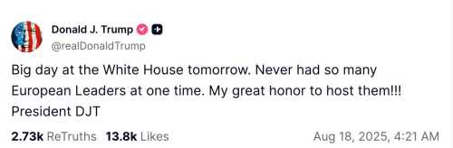– Великий день у Білому домі завтра. Ще ніколи не було стільки європейських лідерів одночасно. Для мене велика честь приймати їх!!! – йдеться у дописі Трампа.