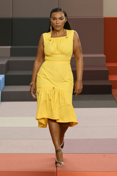 Палома Ельсессер, знайома всім, з'явилася на подіумі, немов сонячне враження, в яскраво-жовтому вбранні. Сукня міді, одна з найпростіших моделей колекції, мала еластичний квадратний виріз горловини та силует без рукавів із зібраним швом під грудьми та товстим поясом для вигідної форми. Проста спідниця отримала спортивний відтінок завдяки набору складок із заниженою талією, що спадали з акценту зі шнурка. Піднявши спортивний стиль та створивши відчуття розкішності, модель йшла в асиметричних туфлях на підборах, масивному золотому браслеті та сережках різної форми.