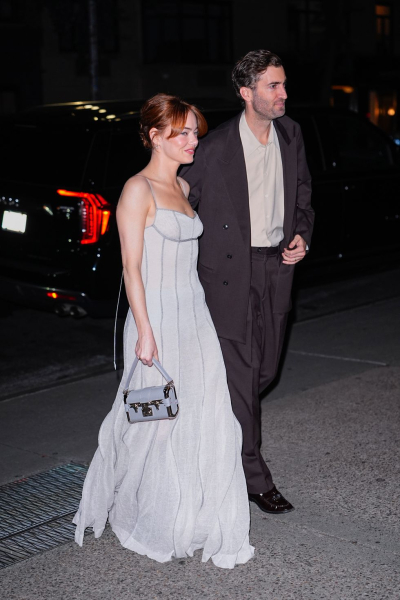 Цей виріб був взятий прямо з подіуму Louis Vuitton весна/літо 2026, на якому Стоун сиділа в першому ряду лише на початку цього місяця. Вона поєднала сукню з блідо-блакитною спідньою білизною з високою талією, що проглядала крізь тонку сіру тканину, і зібрала короткий боб у високу зачіску для створення стриманого, елегантного образу. Вечір вона провела зі своїм чоловіком Дейвом Маккері, який доповнив її образ осіннім костюмом, одягненим у розстебнутий костюм.