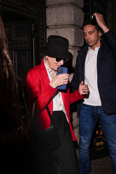 На нових фотографіях Стріп акторку, володарку премії «Оскар», відобразили, коли вона виходила з міського ресторану «Il Salumaio di Montenapoleone». Намагаючись залишатися непоміченою, вона вийшла в щільних чорних окулярах — як Міранда Прістлі — та відповідному капелюсі, використовуючи телефон як щит. Однак її яскраво-червоний піджак не зовсім маскував її. Сміливий плісований блейзер, довгий прямого силуету, був розстебнутий, оголюючи білу блузку з квітковим принтом, заправлену в чорні штани. На руці вона тримала чорну сумку, також розстебнуту.
