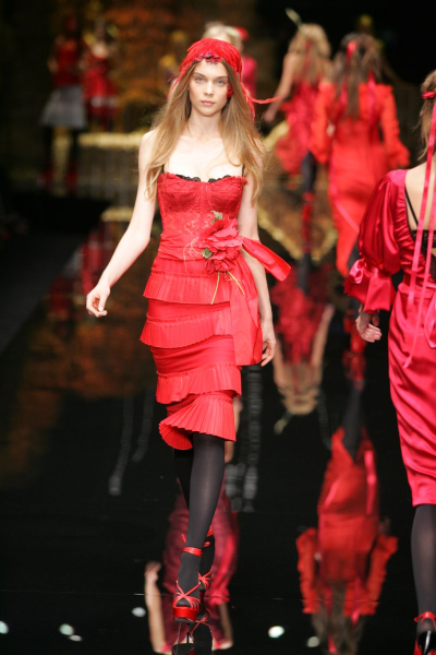 Архівний виріб Dolce & Gabbana з колекції лейблу весна/літо 2006 року, сукня з корсетом спочатку пройшлася подіумом у поєднанні з червоним мереживом, чорною білизною з рюшами, спідницями та клетчастою тканиною. Протягом усієї величезної колекції речі були побудовані на загальному жіночному стилі фермерської дівчини та мотивах пшениці та маку — символах мирного кінця та нового початку. Збіг обставин чи ні, Родріго, яка нещодавно закрила один розділ свого життя, одягла символічний образ на межі чогось нового.