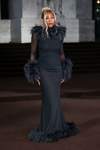 На прем'єрі Серена Вільямс продемонструвала свою підтримку в пір'яному стилі. Її сукня була розроблена з довгими, легкими рукавами, і вона була напівпрозорою чорною сукнею, одягненою поверх боді на бретельках.